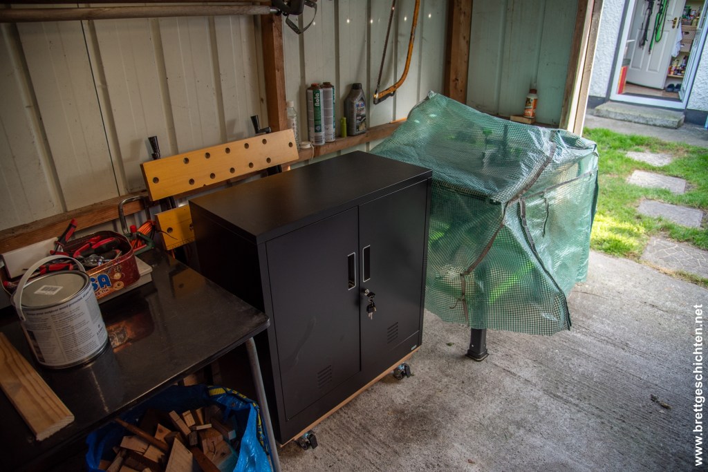 Als zusätzlichen Werkzeugschrank hatte ich mir einen Metallschrank gekauft. Diesem habe ich anstelle der mitgelieferten Füße eine Holzplatte am Boden verpasst, auf der ich 4 Rollen (2 davon mit Bremse) angebracht habe. So kann ich den Schrank nach Bedarf im Schuppen herumfahren.