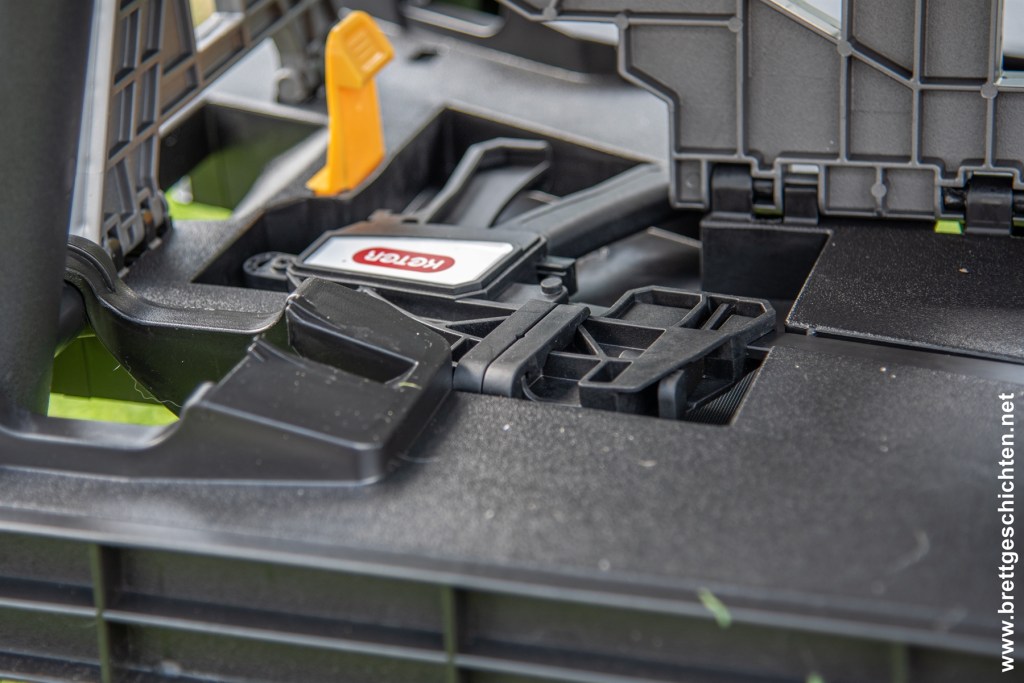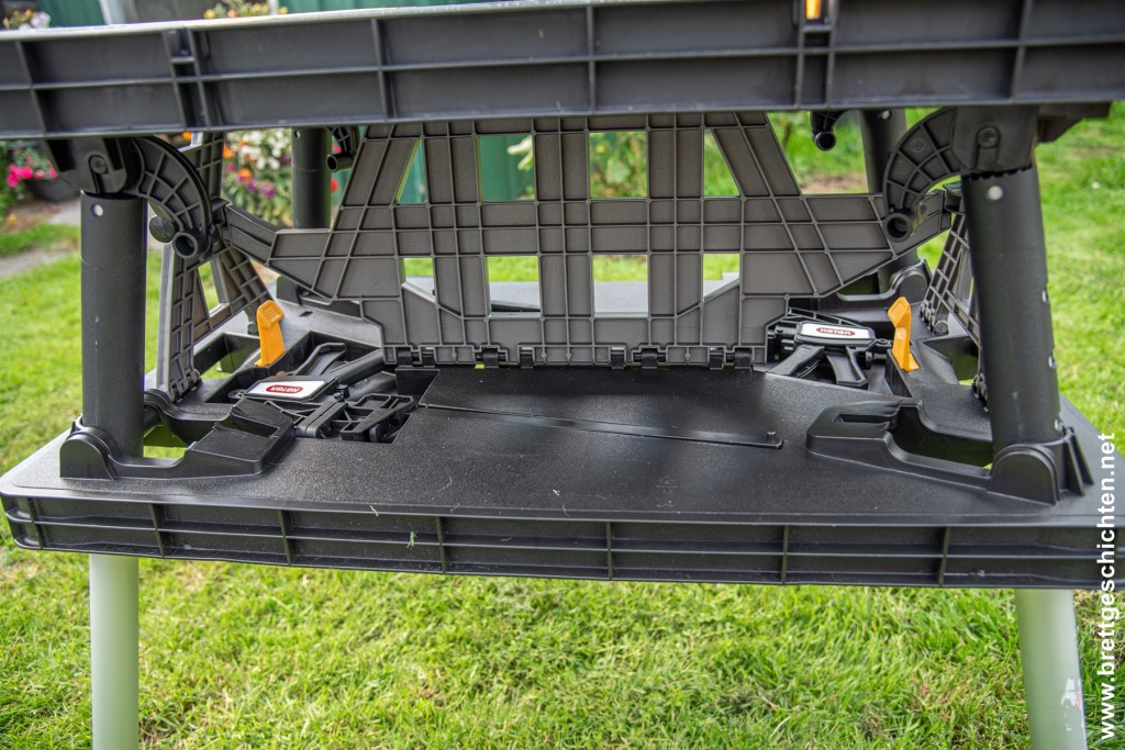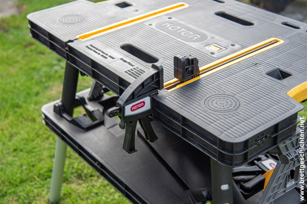 Das geniale ist, im Inneren der Werkbank befinden sich zwei Einhandklemmen mit ca. 30,5 cm, die jeweils in eine Nut geschoben werden können und so das Werkstück festhalten.