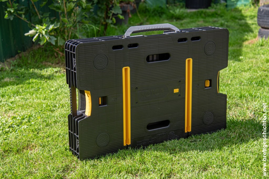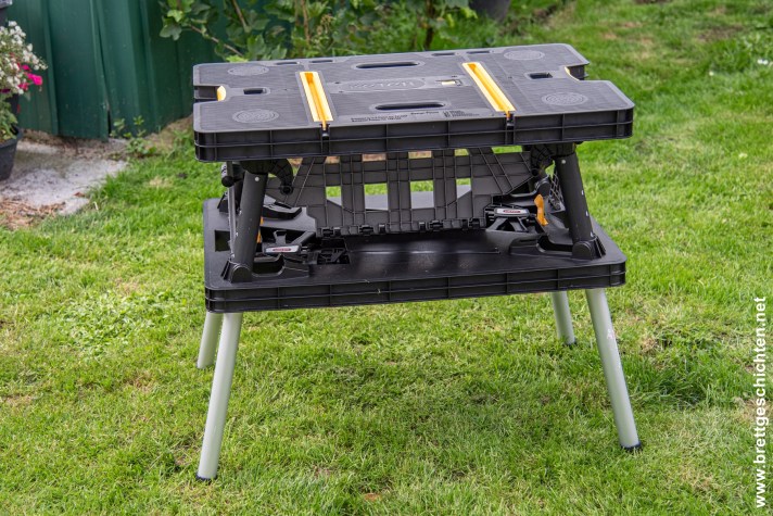Die Werkbank lässt sich in wenigen Sekunden mit beiden Händen aufklappen und hat dann eine Höhe von 75,6 cm.