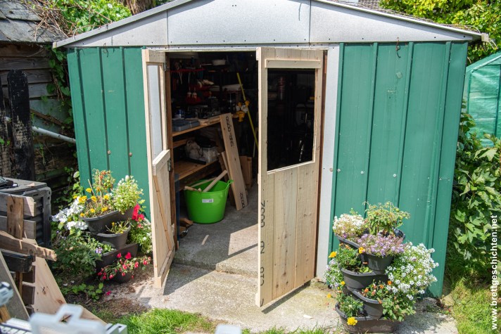 Da bei jedem Regen der Schuppen innen auf eine Breite von gut einem Meter nass wurde, wurden nun Türen notwendig. Schließlich habe ich jetzt die Werkbank und diverse Geräte darin stehen.
