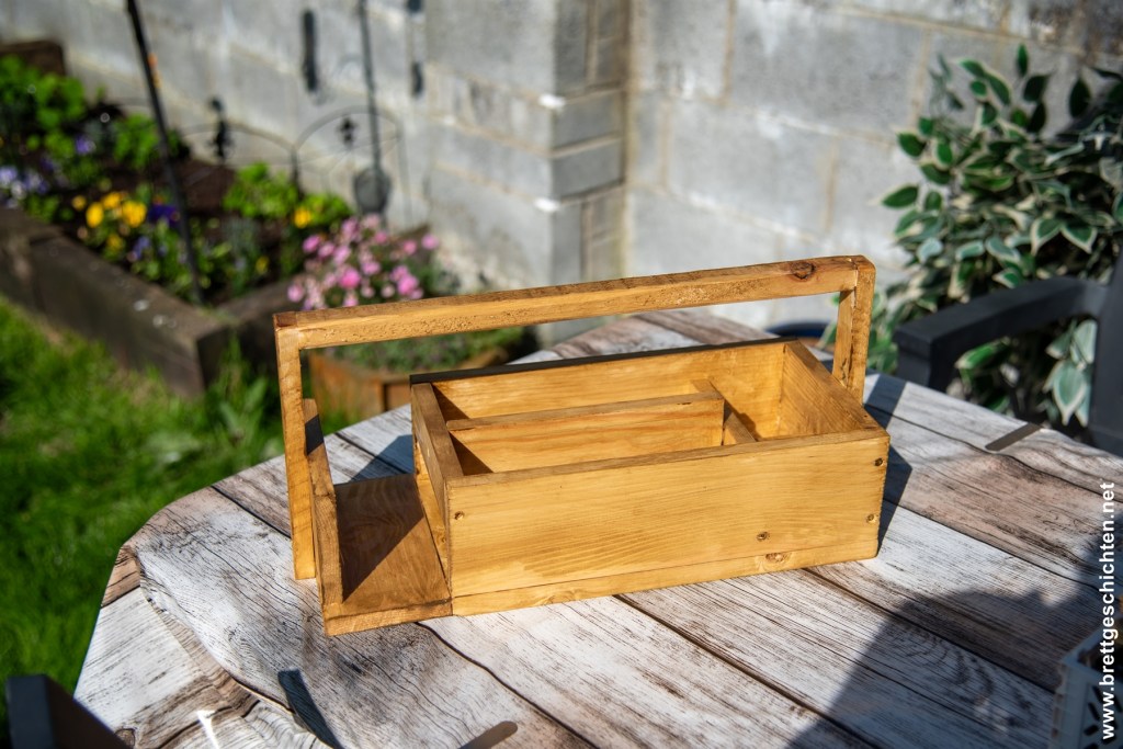 Heute habe ich einen sogenannten Grill-Caddy oder BBQ-Caddy gebaut. So müssen wir nicht immer das Besteck, Soßen, Servietten usw. einzeln auf die Terrasse tragen.